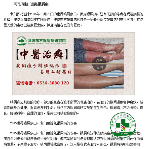 來源:齊魯網 時間:2015-10-27 編輯:濰坊東方銀屑病研究院