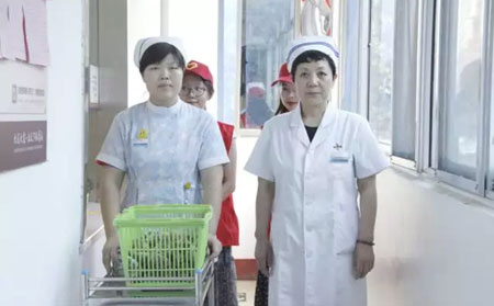 (一大早,董會玲主任與護士長張欣艷開始為患者送粽子)