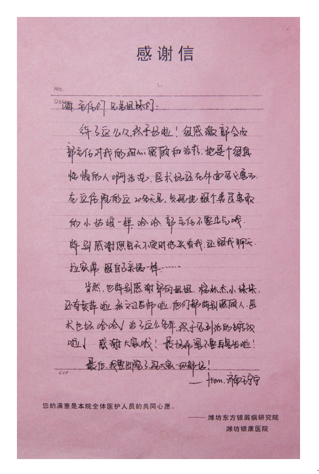當然,也特別感謝郭麗姐姐、楊林杰小妹妹,還有袁萍啦、張文江醫生啦,他們都特別照顧人,醫術也可以,哈哈!治了這么多年,終于見到治的好的治療效果啦!感謝大家哦!非常好希望不要再復發啦!